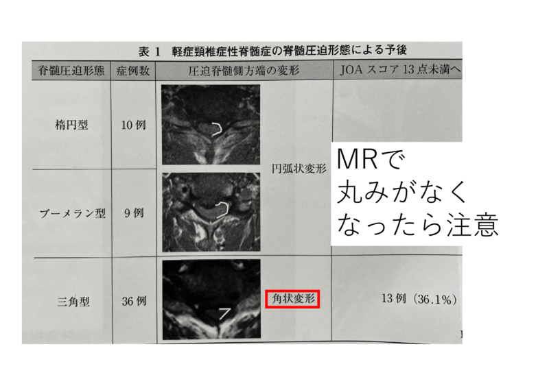 悪化する症例は圧迫の程度、脊髄の形状(ブーメラン、三角型など)、可動域(辷り、高い可動域)に特徴がある。