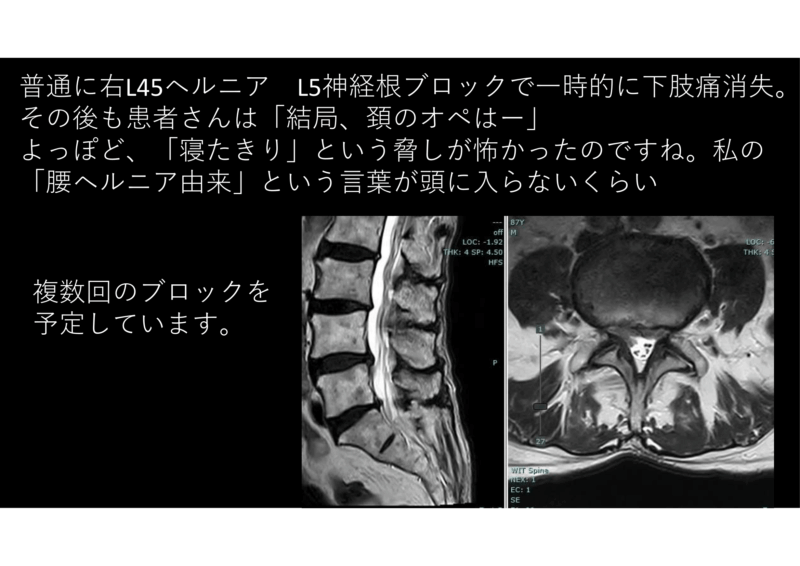 ところで、腰椎の写真を持っていないので、お聞きすると、「ない」、と。「チョ待てよ」レベルです。腰のMRI撮ったら、普通に右L45ヘルニア。右大腿外側の痛み。普通じゃん!