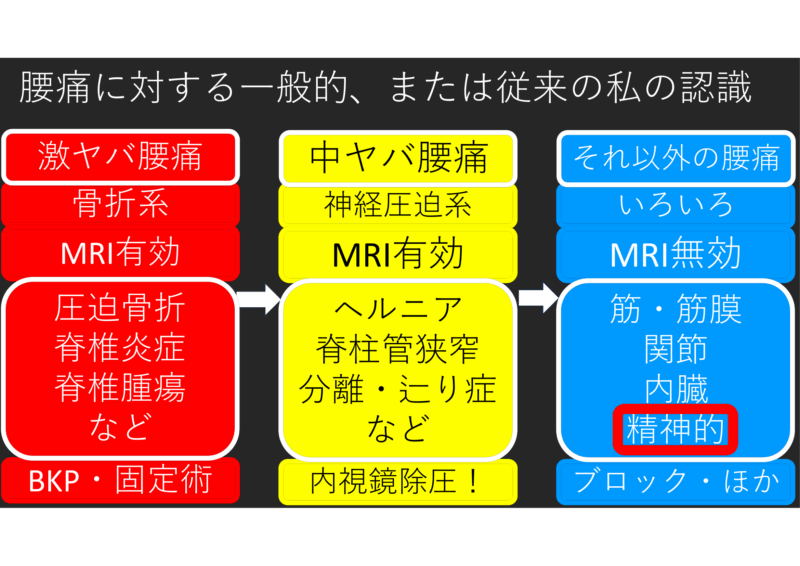 腰痛は3つに分類される。その中の激ヤバ、中ヤバ腰痛ではない、それ以外の腰痛の中の「精神的」腰痛ではないかと思われることをお伝えします。「いろんな検査や医学があなたの腰痛を解明するのに追い付いていない可能性はありますが」という事も場合によってはお伝えします。