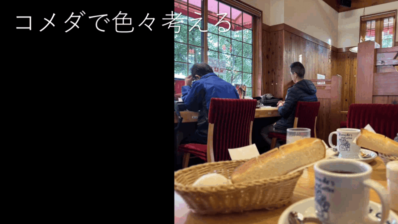 日曜日の朝もコメダ、ノート見つめて「うーん」。(なんと来ていたとは知らずに、知人が撮ってくれました。)