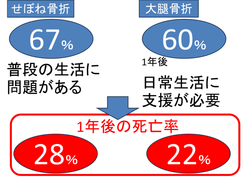 次のデータが怖い! 骨粗鬆症性骨折は若者がサッカーの試合で腕折るのと訳が違うんです。普通に筋力・知力低下傾向の老人ですから、骨折によってどんどん生活レベルが下がり、死亡率が上がるんです!!!