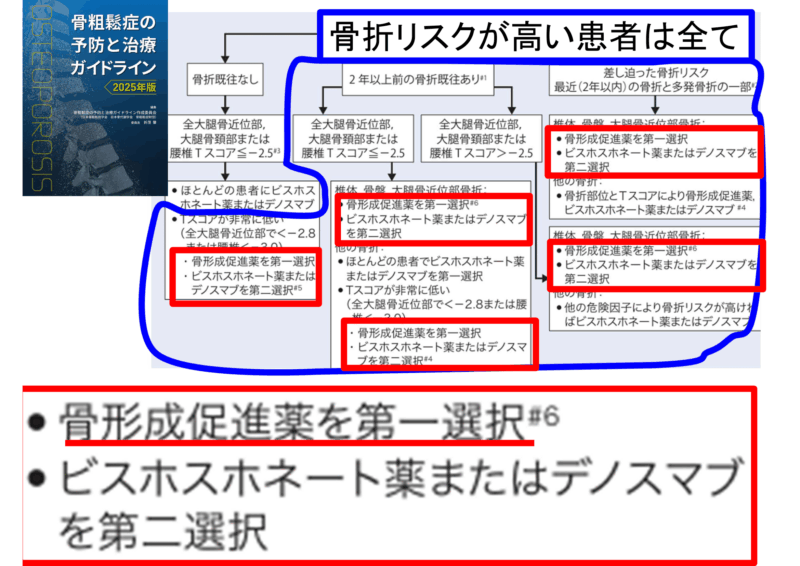 2025年のガイドラインでは「骨形成促進薬投与が第一選択!」「初めに骨形成促進薬を使うのが重要」という点がかなり強調されています。今までよく使われていたボノテオ、ボナロンや、半年に1回注射でらくちんなプラリアなどの骨吸収抑制薬を第一に使うのは骨折リスクの少ない患者さんだけ。