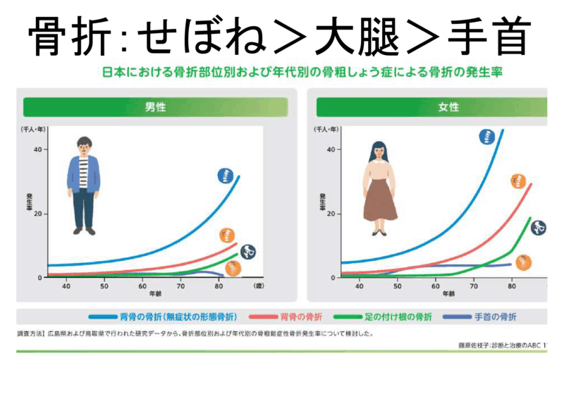 実際に骨がこんな感じになり、折れやすくなります。 せぼね>大腿骨>手首の順に多く折れます。女性>男性です。