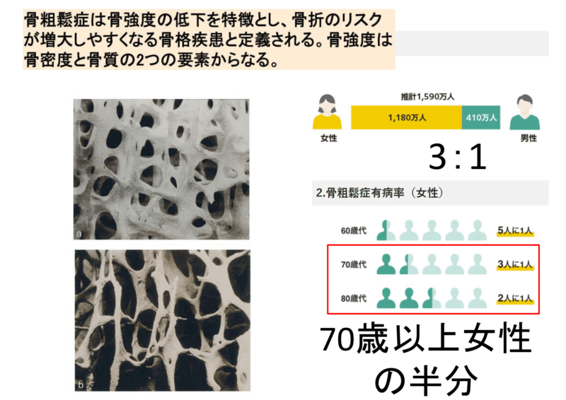 高い薬を嫌がる患者さんに勧めるのは無理ですが、骨形成促進薬の利点、使わない不利益をしっかり説明するのが我々の仕事であり、社会貢献、そして患者さんへの愛です。そういう事で、骨粗鬆症について基本事項をいくつか示します。 骨粗鬆症は女性に多く、70歳以上の女性では半分が骨粗鬆症です。