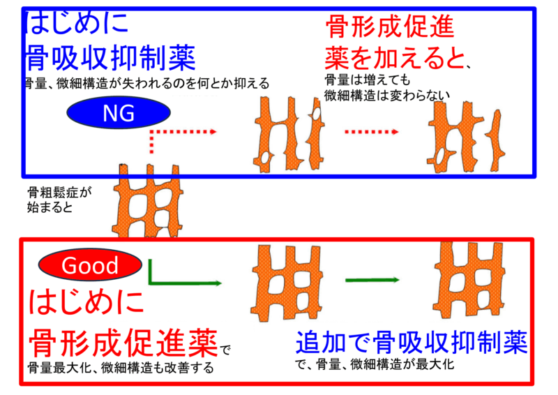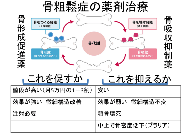順序は逆になりますが、骨粗鬆症を治すには大きく分けて二つ。 骨を作る力を強めるか、骨が吸収されるのを遅くするか、なんです。【骨粗鬆症】新規薬剤「オスタバロ」骨形成促進薬