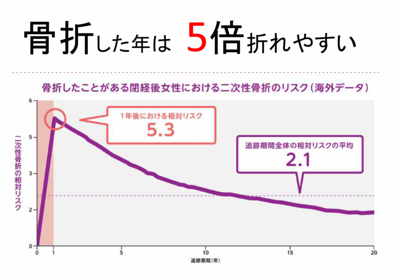 クリニックに腰が痛くて来られ、(新規)圧迫骨折が見つかり、骨密度は低い、という方は、その後1年間の再骨折率は5倍に上がるのです。ただでさえ折れやすい年齢と状態で、かつ5倍折れやすいって、どういう事! もっとこのやばさをわかって!