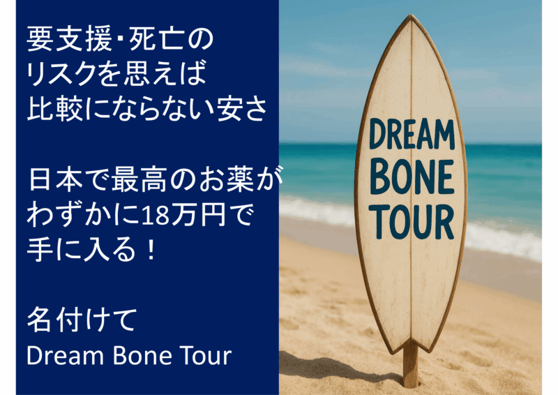 仮に3割負担の方が骨折の危険性の高い骨粗鬆症であることが判明したら、特に骨折で発見された場合には、少しお金はかかりますが、毎月3割、窓口15000円の注射を1年間続けましょう。この1年を私はDream Bone Tourと勝手に名付けました。