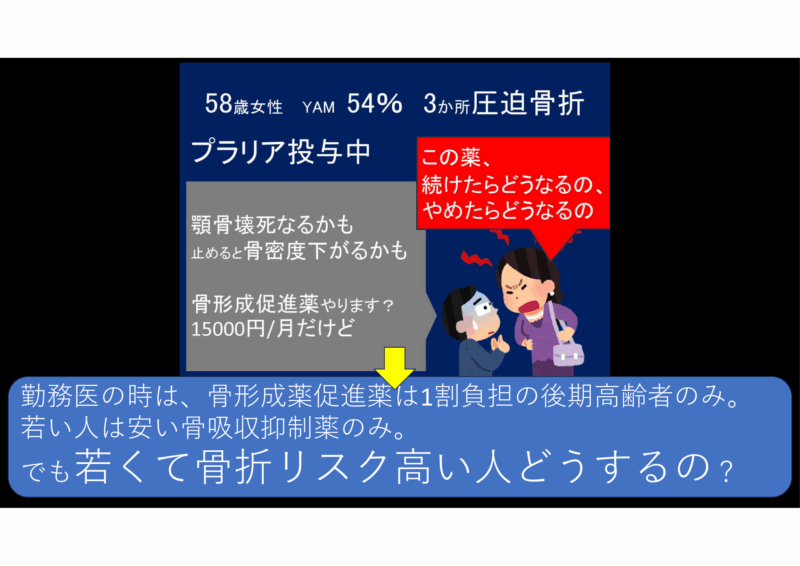 必要時には他院で股関節、せぼねの骨密度を測りなおします。骨形成促進薬もどんどん出しています。正直言って若い人に骨形成促進薬勧めると、高くて嫌がるので単純に全く投与していなかったのです。問題は自分が確固たるポリシーをもって突き詰めていなかったという事。