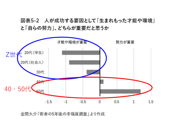 成功するには「努力が必要」と我々は思いますが、若者は「才能、環境がすべて」とのこと。いわゆる「ガチャ」です。ガチャを努力で取り返すことはしないんですね。まあ、生きていけるしね。