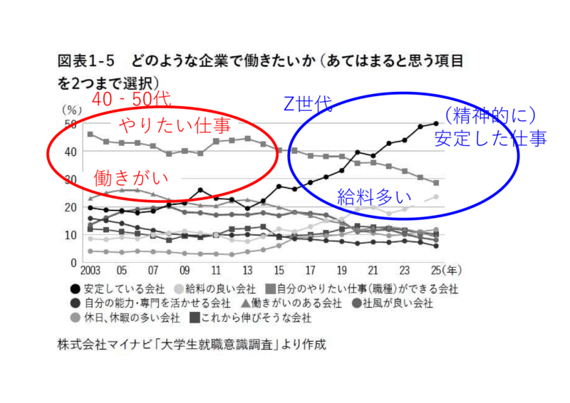 理想の会社は20年前に多かった「やりたい仕事」、「働き甲斐」よりも「精神的に(充実感ではなく)安定が得られる会社」が人気。そして最近は「給料の多い会社」が上昇して、「やりたい仕事」を逆転しそうな勢い。