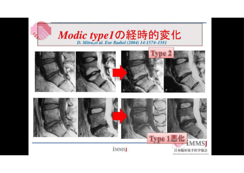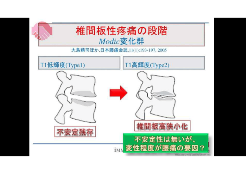 Modic変化は椎体終板変性なんですが、進んだ方、年取った方が安定するんです。腰痛も減ります。患者さんは訳わからんでしょうね。はい、ゆっくりまとめましょう。