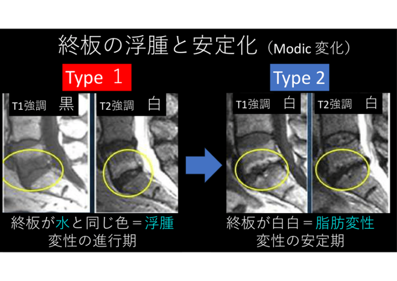 終板がT1黒、T2白をModic type 1、T1白、T2白をType 2と言います。