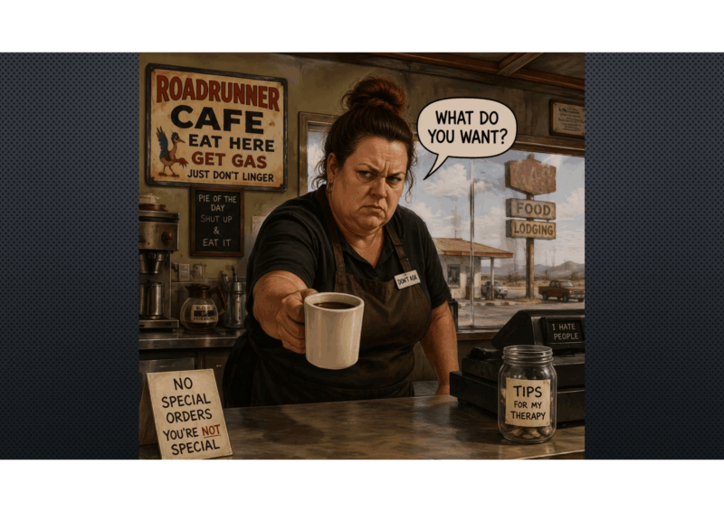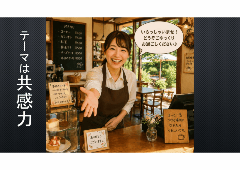 ここで、全く相手(お客)の共感力に期待しないと、昔の映画に出てくるアメリカのロードサイドカフェみたいに、めちゃくちゃぶっきらぼうな接遇になります。(偏見かも)